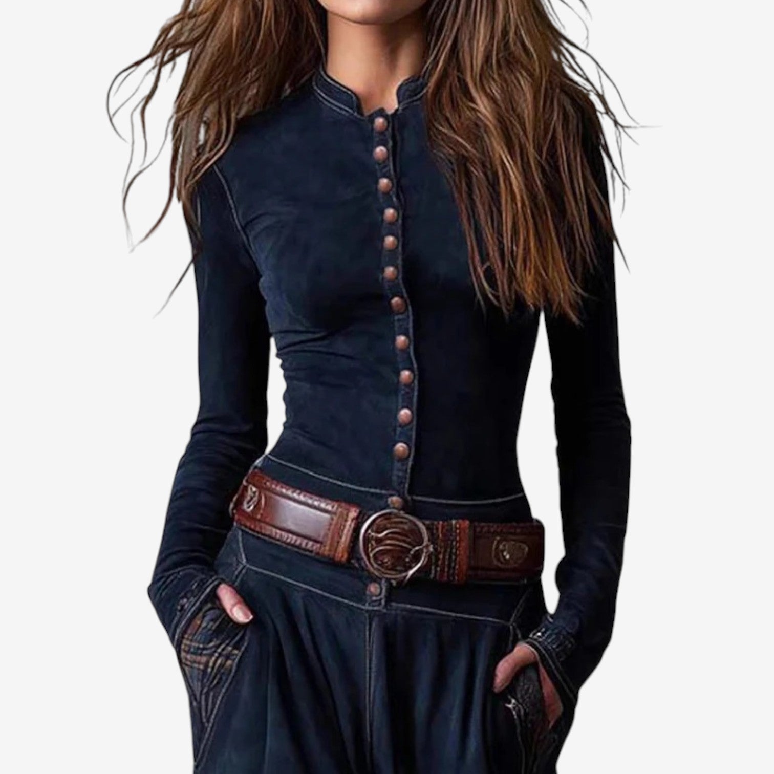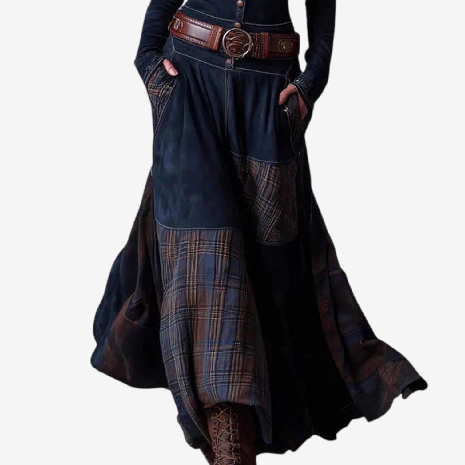 Njezin pripijen gornji dio s metalnim gumbima naglašava siluetu, dok lepršava patchwork suknja dodaje dinamiku i šarm pri svakom koraku. Haljina dizajnirana za žene slobodnog duha i profinjenog ukusa.