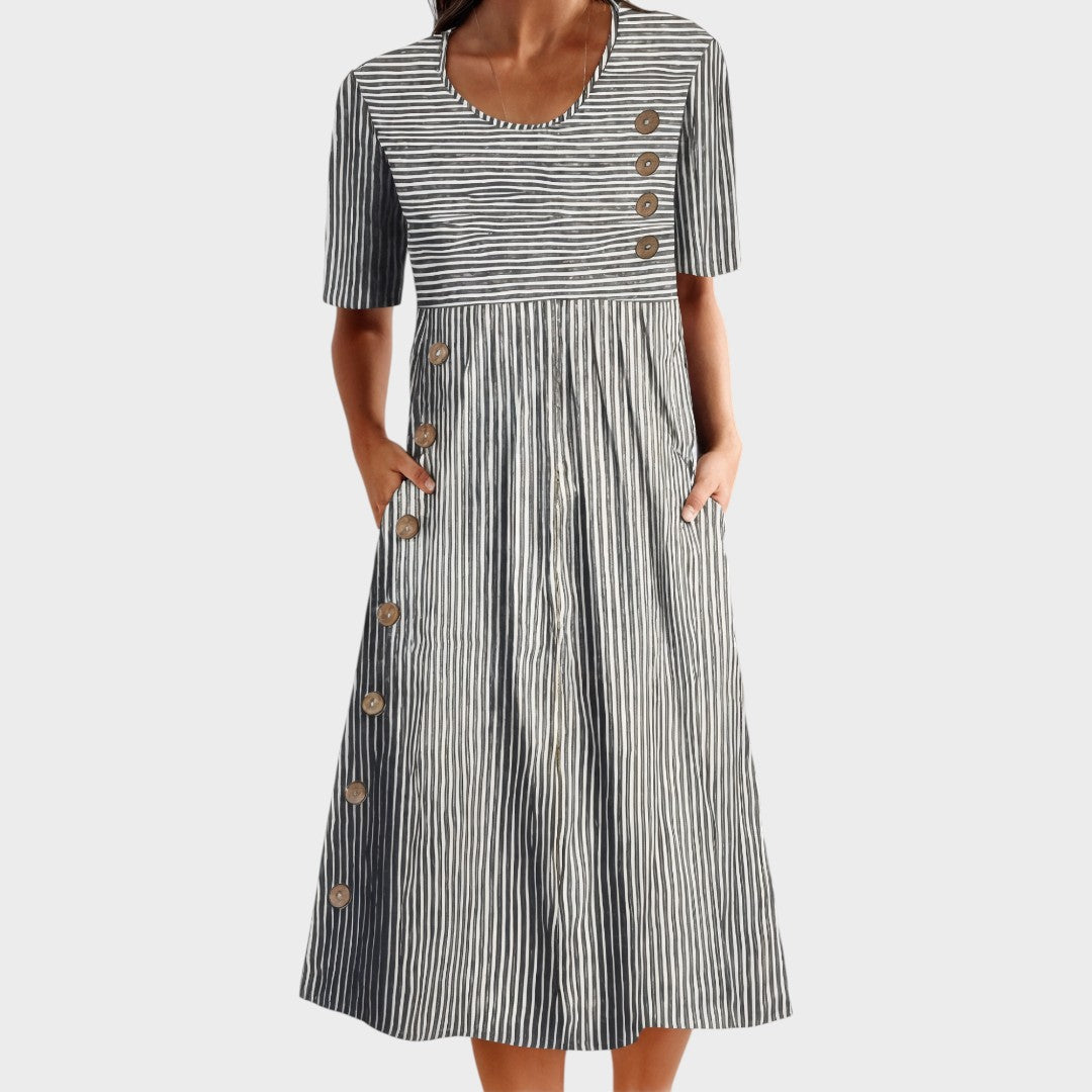 Ova haljina od visokokvalitetnog pamuka donosi savršen spoj elegancije i udobnosti. Sa ženstvenim krojem, praktičnim džepovima i detaljima s gumbima, lako se uklapa u dnevne i večernje prilike. Idealna je za one koje žele izgledati dotjerano, a osjećati se opušteno.