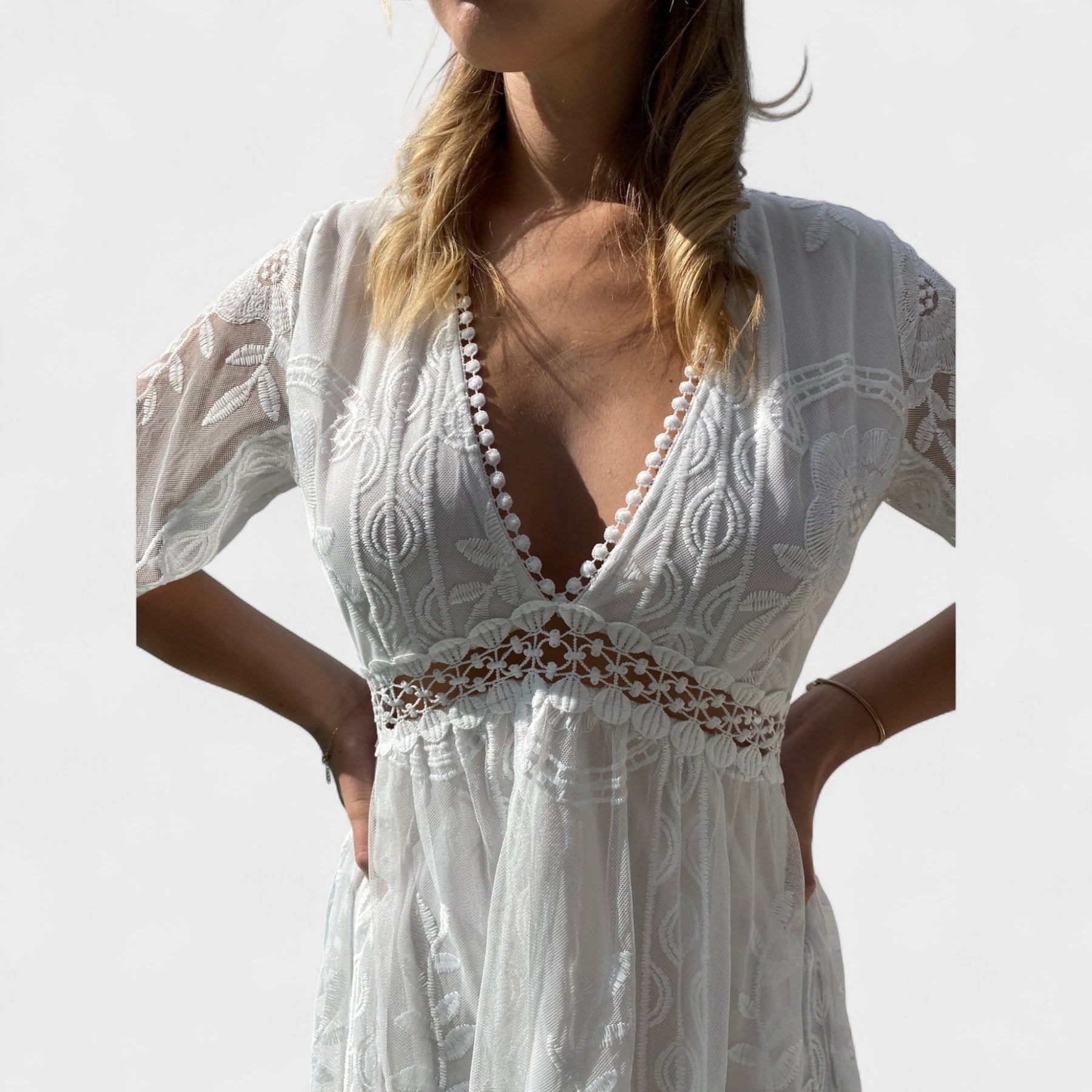 Ova boho čipkasta haljina donosi savršenu kombinaciju profinjenosti i opuštenog stila. Lepršava silueta i prekrasni čipkasti detalji čine je idealnim izborom za ljetne večeri, posebne događaje ili romantične šetnje uz more. Haljina koja naglašava ženstvenost i donosi bezvremensku eleganciju.