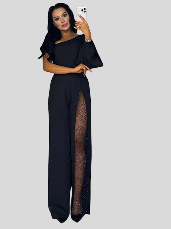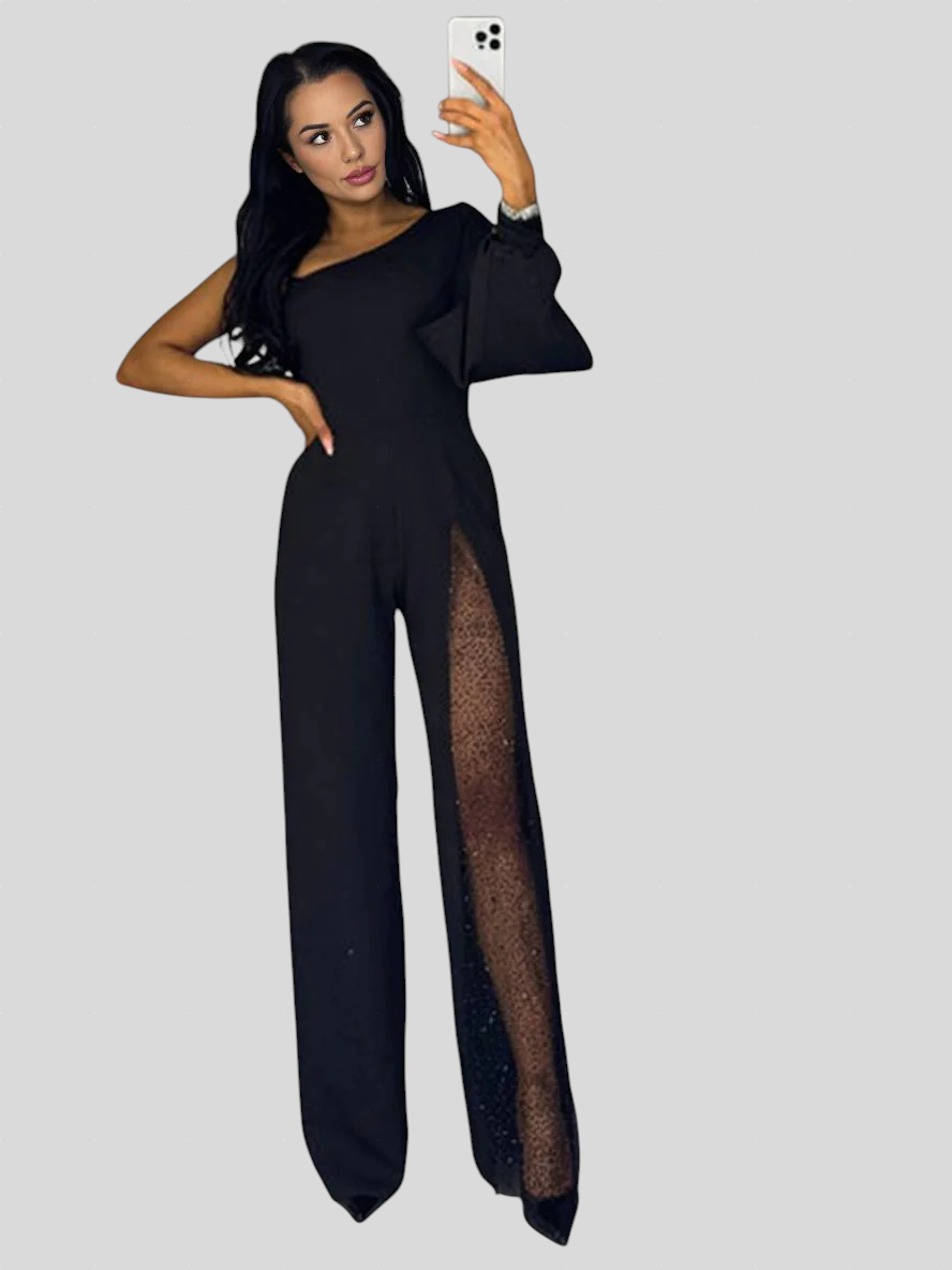 Ovaj kombinezon spaja eleganciju i odvažnost u savršenom skladu. Asimetrični kroj s jednim ramenom naglašava ženstvenost, dok prozirni dio s diskretnim sjajem dodaje dašak luksuza i profinjenosti. Savršen za večernje prilike, koktele ili posebne događaje, ovaj model ističe figuru i ostavlja snažan dojam gdje god se pojavite.