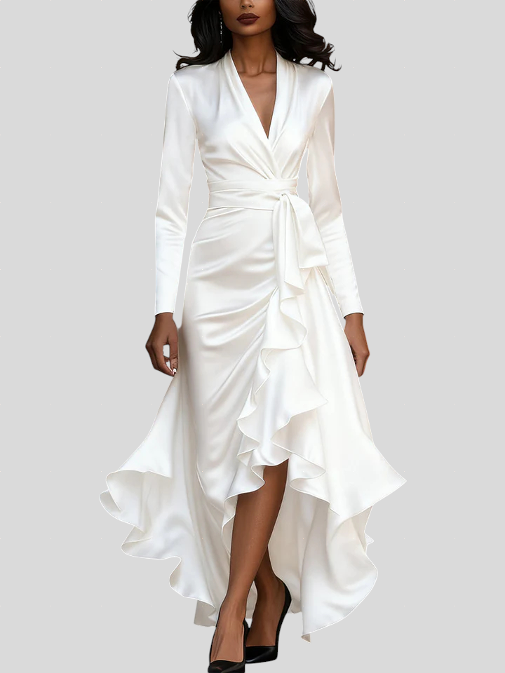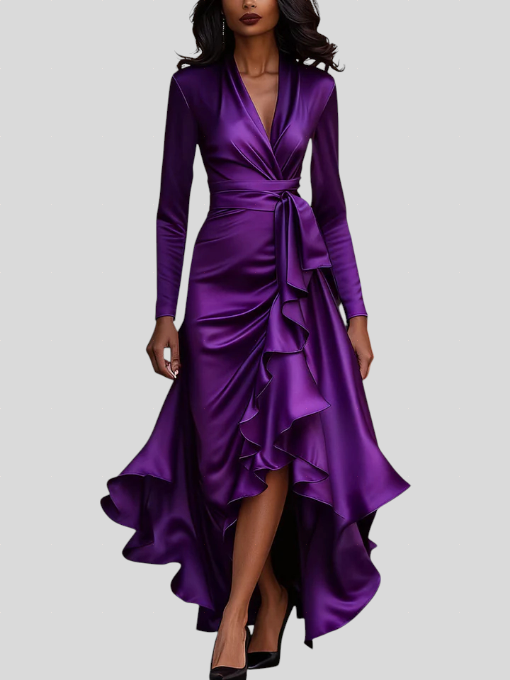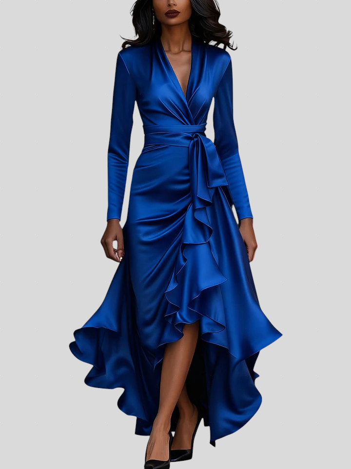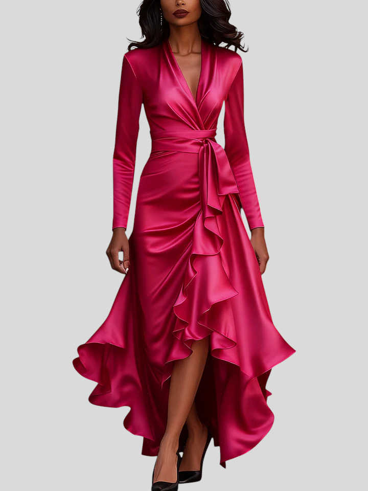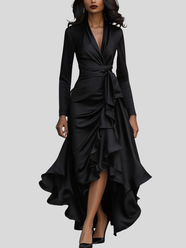 Ova haljina utjelovljuje spoj elegancije, samopouzdanja i luksuza. Izrađena od visokokvalitetnog satena koji nježno prianja uz tijelo, naglašava prirodne linije i kreće se s lakoćom pri svakom koraku. Romantični volani i pojas u struku stvaraju savršenu ravnotežu između ženstvenosti i profinjenosti, čineći ovu haljinu idealnim izborom za večernje događaje, svečane prilike ili romantične večere.
